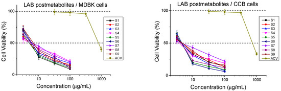 The results in Table 1 reveal that all postbiotics are significantly more toxic than the reference chemotherapeutic acyclovir (ACV). Quite expectedly, the cytotoxicity was slightly higher in CCB cells, most likely because the exposure of the latter to the compounds lasted 24 h longer (72 h) than that of MDBK cells (48 h). In general, the Mix-sample group (S7, S8, and S9) had the greatest similar CC50 values corresponding to the lowest toxicity. S9 was minimally cytotoxic, followed by S6, S3, S1, and S4. The highest cytotoxicities (although in the order of the other samples) were demonstrated by S5 and S2 (Table 1).