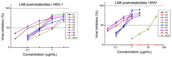 Virucidal activity of LAB postmetabolites against HSV-1 and KHV virions.