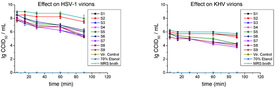The adsorption of KHV also appeared to be dependent on the incubation time. At 15 min after exposure, the strongest effect was observed for S5 (Δlg = 2.0), followed by S3, S4, and S6 (Δlg = 2.0), then S2 (Δlg = 1.75). The samples from the Mix group showed negligible activity at Δlg ≤ 1.0. As the exposure time increased, their activity considerably improved, and at the 60th min, they lowered the viral titer by Δlg ≥ 5. The activity of the other postbiotics also increased with the exposure time and, at 60 min, reached Δlg = 4.0 (at S5), Δlg = 3.75 (at S2), Δlg = 3.5 (at S6), and Δlg = 3.0 (at S3 and S4). The inhibitory effect of S1 on the adsorption of both herpes viruses was weak, being slightly stronger for HSV-1 (Table 4).