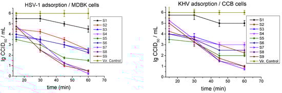 Initially, when HSV-1 was exposed to S3, S7, S8, and S9 for 5 min, the titers decreased only by Δlg = 1.25. The virucidal effect then increased proportionally to the incubation time. At 60 min of exposure, all samples except S1 and S2 significantly inhibited virions, as calculated for S3 and S7 with Δlg = 2.5; S4, S8, and S9 with Δlg = 2.0; and S5 and S6 with Δlg = 1.75 compared to viral control with no substance added. At the longest investigated time interval, some samples reached considerable virus-neutralizing action: S7 and S9 decreased titers by Δlg = 2.75, S8 by Δlg = 2.5, and S5 by Δlg = 2.0. If the virucidal effect of KHV virions is compared to that of HSV-1, the inhibition is significantly weaker. Only S7 showed an effect at 60 min of exposure with Δlg = 1.75, followed by S3, S4, S6, S8, and S9 with Δlg = 1.5 at the same time interval. Regarding KHV, only the Mix group showed a significant inhibitory effect: S7 (Δlg = 2.0), and S8 and S9 (Δlg = 1.75) at the longest time interval of 90 min. Samples S1 and S2 did not exert virucidal activity against both HSV-1 and KHV virions at any of the incubation times studied (Table 3).