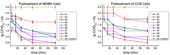 The protective effect on CCB cells was slightly lower than that on MDBK cells. At 5 min of exposure, the Mix group and S4 reduced viral titers by Δlg = 1.75. For all postmetabolites, once again, the influence increased with the exposure time. At the 120th min, the most distinct effect was seen for S9 (Δlg = 3.0), followed by S8 (Δlg = 2.75) and S7 (Δlg = 2.5). Four other postmetabolites demonstrated a protective effect of Δlg = 2.0 (S3–S6). S1 and S2 did not have a significant protective effect on MDBK and CCB cells, and even at the longest time interval, viral titer reduction was only Δlg ≤ 1.25 (Table 5).
