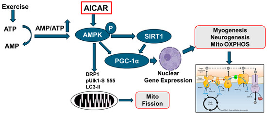 Exercise consumes a large amount of ATP, elevating the AMP-to-ATP ratio. Increased AMP binds to the enzyme AMPK and induces the phosphorylation of AMPK (Figure 1). On the other hand, AICAR directly phosphorylates AMPK. (1) Phosphorylated AMPK activates SIRT1/PGC1-α in the catabolic process of exercise (increased OXPHOS), resulting in decreased body weight, reduced triglycerides, improved HOMA-IR index and lower NEFA levels; (2) phosphorylated AMPK activates PGC-1α co-transcriptional complexes that initiate the overexpression of target genes to promote myogenesis, neurogenesis, and mitochondrial bioenergetics; and (3) phosphorylated AMPK led to phosphorylation of mitochondrial fission factor (MFF), recruitment of dynamin-like protein DRP1 to mitochondria, and activation of ULK1, an upstream kinase in autophagy and mitophagy. Mitochondrial fission allows damaged mitochondria to be selectively degraded through mitophagy pathways. The main points of this paper are boxed in red.