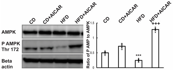 Western blot analysis of AMPK and quantification of phospho-AMPK to total AMPK (Figure 2). DRG neurons were isolated from CD (n = 6), CD+AICAR (n = 6), HFD (n = 6), and HFD+AICAR (n = 6) mice, and protein extracts were prepared. Antibodies recognize total AMPK, AMPK phosphorylated at the Thr 176 residue, and beta-actin. The levels of expression were quantified by the intensity of the bands. The ratio of pAMPK to total AMPK was calculated, and the values were analyzed by ANOVA. The significance is denoted by the following p-values: *** p < 0.001; CD or CD+AICARD vs. HFD, +++ p < 0.001; HFD vs. HFD+AICAR.