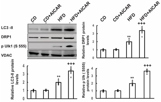 Western blot analysis of proteins involved in mitophagy in neuronal mitochondria isolated from CD (n = 6), CD+AICAR (n = 6), HFD (n = 6), and HFD+AICAR (n = 6) mice. Western blots were carried out on the protein extracts using anti-LC3, anti-DRP1, anti-phospho (S555) ULK1, and anti-VDAC. The levels of expression were quantified based on the intensity of the bands. The relative ratio was calculated, and the values were analyzed by ANOVA. The significance is denoted by the following p-values: ** p < 0.01 HFD vs. CD or CD+AICAR; +++ p < 0.001 HFD+AICAR vs. HFD.