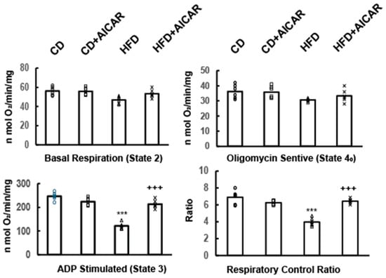 Impaired ADP-stimulated mitochondrial respiration in HFD mice was prevented by AICAR treatment. Oxygen consumption rate (OCR) was measured in the presence of complex I substrates (malate/glutamate) with the subsequent and sequential addition of ADP, oligomycin, and rotenone + antimycin A to mitochondria to measure state 2 (basal), state 3 (ADP-stimulated), state 40 (oligomycin-sensitive), and FCCP-induced respiration rates were measured. ADP-stimulated respiration was significantly decreased in neuronal mitochondria from HFD-fed mice compared to CD and CD+AICAR-treated mice. Administration of AICAR to HFD-fed mice significantly increased ADP-stimulated respiration. The respiratory control ratio (RCR) was calculated. *** p < 0.001 HFD vs. CD, CD+AICAR. +++ p < 0.001 HFD vs. HFD+AICAR.