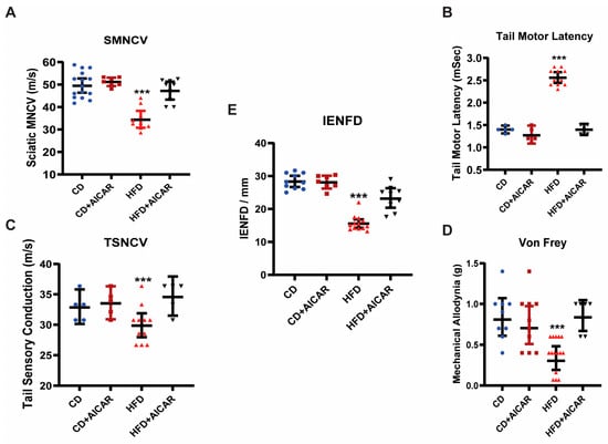 We tested if administration of AICAR would prevent HFD-induced peripheral neuropathy. AICAR was injected into HFD-fed mice for 4 months. After 4 months of HFD feeding (n = 6), C57BL6 mice showed a significant slowing of sciatic motor nerve conduction velocity (SMNCV, Figure 5) (from 41 ± 2 m/s with a CD to 29 ± 1.2 m/s with an HFD; p < 0.001), increased tail motor latency (TML, from 1.3 ± 0.07 ms in CD to 2.67 ± 0.3 ms; p < 0.001 with an HFD), and decreased tail sensory nerve conduction velocity (TSNCV, from 34.6 ± 0.9 m/s in CD to 29 ± 1.4 m/s in HFD; p < 0.001). These changes in nerve conduction velocity (NCV) in HFD-fed mice were consistent with the development of peripheral neuropathy. There was no statistically significant difference in the compound muscle action potential (CMAP) or sensory nerve action potential (SNAP) amplitudes compared between groups or compared at the start and end of the treatment. This is expected because of considerable variability in the CMAP and SNAP amplitudes obtained in nerve conduction studies (NCS) in both mice and humans, especially when interval repeat studies are performed [26,27,28]. The CMAP sciatic amplitudes (mV) after 4 months of treatment were as follows: CD: 7.28 ± 2.42 (SEM); CD+AICAR: 5.53 ± 1.65; HFD: 3.60 ± 0.98; HFD+AICAR: 3.602 ± 0.979. The CMAP tail amplitudes (mV) after 4 months of treatment were as follows: CD: 1.58 ± 0.15; CD+AICAR: 1.71 ± 0.09; HFD: 1.22 ± 0.18; HFD+AICAR: 1.57 ± 0.37. The SNAP tail amplitudes (μV) after 4 months of treatment were as follows: CD: 93.45 ± 9.20; CD+AICAR: 103.21 ± 15.01; HFD: 126.51 ± 26.39; HFD+AICAR: 95.18 ± 10.09.