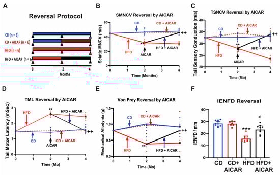 Two months of AICAR treatment reversed HFD-induced neuropathy in C57BL6 mice (n = 6/group). Three-month-old C57BL6 WT mice were fed with either a control diet (CD) or a high-fat diet (HFD). Baseline NCSs were completed at the beginning of the study. At 2 months, SMNCV, TML, TSNCV, and MA were measured in the mice fed a CD and the mice fed an HFD. After confirming that consumption of the HFD for 2 months induced development of peripheral neuropathy as observed by the changes in the NCSs and MA, AICAR was administered to the CD and HFD mice at a dose of 500 mg/kg for an additional 2 months. The vehicle was administered to CD and HFD mice. Nerve conduction studies were performed 2 months after administration of the AICAR or vehicle. The protocol is described in (A), the results of SMNCV (B), TSNCV (C), TML (D), MA using the Von Frey filament paw withdrawal threshold method (E), and intraepidermal fiber density (F) are shown. Statistical comparisons were made among the three groups with the ANOVA and post hoc Tukey test. * p < 0.05, ** p < 0.01, and *** p < 0.001; HFD mice at 2 months compared to 0-month-old HFD and CD mice in all parameters. ++ p < 0.01, HFD+AICAR mice at 4 months compared to HFD at 2 months in all parameters. The administration of AICAR reversed all the deficits of HFD-induced neuropathy. The administration of AICAR to non-diabetic mice had no significant effect. There was no statistically significant difference in CMAP or SNAP amplitudes compared between groups or compared at the start, during, and at the end of the treatment. The baseline (prior to starting any treatment) CMAP sciatic amplitude (mV) was 6.17 ± 0.78; CMAP tail amplitude (mV) was 3.050 ± 0.60, and SNAP tail amplitude (μV) was 51.92 ± 13.08. The CMAP sciatic amplitudes (mV) after 4 months of treatment were as follows: CD: 5.14 ± 0.99 (SEM); CD+AICAR: 5.70 ± 1.68; HFD: 8.31 ± 1.66; HFD+AICAR: 5.09 ± 0.76. The CMAP tail amplitudes (mV) after 4 months of treatment were as follows: CD: 1.24 ± 0.24; CD+AICAR: 2.16 ± 0.41; HFD: 2.96 ± 0.96; HFD+AICAR: 1.87 ± 0.70. The SNAP tail amplitudes (μV) after 4 months of treatment were as follows: CD: 102.48 ± 24.88; CD+AICAR: 126.77 ± 22.88; HFD: 56.21 ± 19.47; HFD+AICAR: 77.375 ± 19.46. There was no statistically significant difference in the CMAP or SNAP amplitudes during the reversal study, compared between groups or compared at the start and end of the treatment. This is as expected because of considerable variability in the CMAP and SNAP amplitudes [26,27,28].