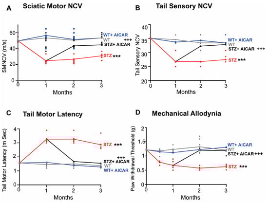 AICAR reverses STZ-induced neuropathy in C57BL6 mice (n = 6/group). Three-month-old C57BL6 WT and STZ-induced diabetic mice were purchased from Jackson Labs. The mice were fed with a control diet for a month. Measurement of NCSs and MA after a month showed that the STZ mice had developed neuropathy. Some of the STZ mice were then administered AICAR at a dose of 500 mg/kg for an additional 2 months. NCSs were performed at 5 and 6 months of age, namely after 2 and 3 months of STZ-induced diabetes or after 1 or 2 months of AICAR treatment. The results are shown as follows: SMNCV (A), TSNCV (B), TML (C), and MA (D) using the Von Frey filament paw withdrawal threshold method. Statistical comparisons were made among the three groups with the ANOVA and post hoc Tukey test. *** p < 0.001; STZ at experimental time 3 months compared to 1 month in all parameters. +++ p < 0.001, STZ+AICAR at experimental time 3 months compared to STZ at 1 month in all parameters. Thus, administration of AICAR reversed all the peripheral neuropathy deficits of STZ mice.