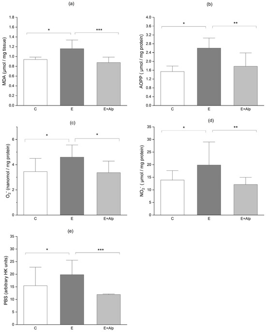 The effects of alpinetin on oxidative/nitrosative stress parameters: (a) MDA, (b) AOPP, (c) O2−, (d) NO2−, (e) PAB. The values are represented by mean ± SD; *** p < 0.001, ** p < 0.01, * p < 0.05. Abbreviations: MDA—malondialdehyde; AOPP—advanced oxidation protein product; (c) O2− superoxide anion radical; (d) NO2—nitrite; (e) PAB—pro-oxidant–antioxidant balance; C—control group; E—ethanol group; E+Alp—ethanol + alpinetin group.