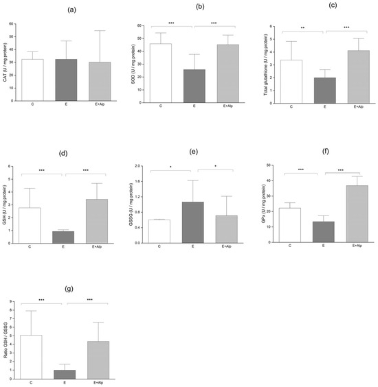 Further analysis of hepatic antioxidant capacity demonstrated a significant decrease in reduced GSH, total glutathione (GSH), glutathione peroxidase (GPx), and increased oxidized glutathione (GSSH) levels in the E group compared to control values (reduced GSH, total GSH, GPx, GSSH; p < 0.001, p < 0.01, and p < 0.05, respectively) (Figure 2c–f). Further, the GSH/GSSH ratio, a marker of oxidative stress, was significantly reduced in the E group compared to the control group (p < 0.001). Alpinetin supplementation led to a significant increase in total GSH reduced GSH, GPx, and the GSH/GSSH ratio, while significantly decreasing oxidized GSH levels in comparison to the E group (p < 0.001 and p < 0.05, respectively) (Figure 2c–g).