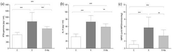 The effects of alpinetin on (a) IFN-γ, (b) IL-4, and (c) MPO activity. The values are represented by mean ± SD; *** p < 0.001, ** p < 0.01. Abbreviations: IFN-γ—interferon-gamma; IL-4—interleukin 4; MPO—myeloperoxidase; C—control group; E—ethanol group; E+Alp—ethanol + alpinetin group.