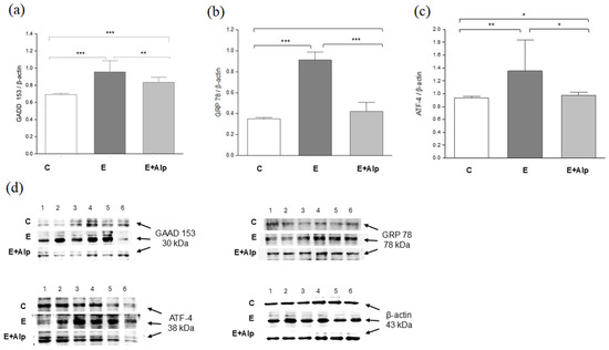 Hepatic levels of CADD153 and ATF4 in the E+Alp group were significantly increased in comparison to control values (p < 0.001, p < 0.05, respectively) (Figure 4a–c).