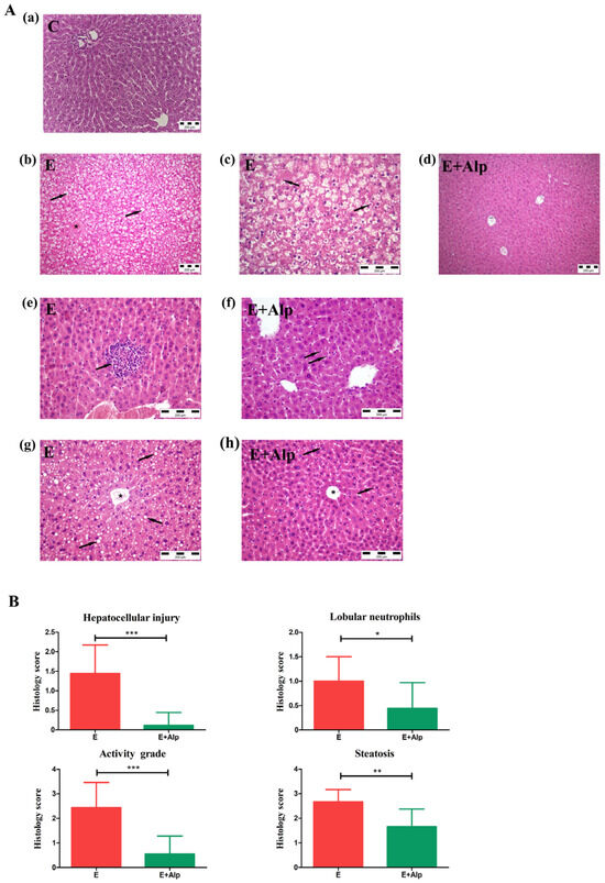 (A) Normal liver histology (A(a)); liver histology of mice in the E group (A(b,c,e,g)); liver histology of mice in the E+Alp group (A(d,f,h)). (A(b)) hepatocellular injury (ballooning). Numerous hepatocytes are ballooned, showing cytoplasmic clearing (arrows). The image also shows a central vein (asterisk). H&E stain, magnification ×200; (A(c)) Numerous hepatocytes are ballooned, showing cytoplasmic clearing, with some exhibiting Mallory bodies (arrows). H&E stain, magnification ×400; (A(g)) Steatosis. Numerous hepatocytes exhibit fatty changes, with fat vacuoles observed in the cytoplasm (arrows). The image also shows a central vein (asterisk). H&E stain, magnification ×400; (A(e)) lobular neutrophils. Numerous neutrophils are present between hepatocytes (arrow). H&E stain, magnification ×400. (A(d)) The depicted hepatocytes do not show ballooning. H&E stain, magnification ×200; (A(h)) A few hepatocytes exhibit fatty changes with sparse microdroplets (arrows). H&E stain, magnification ×400; (A(f)) Scattered neutrophils are present between hepatocytes. H&E stain, magnification ×400. (B) Histology score of hepatocellular injury, lobular neutrophils (activity grade), and steatosis in the E and E+Alp groups (*** p < 0.001, ** p < 0.01, * p < 0.05 vs. E group).