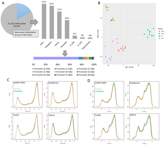 In this study, the custom Infinium array “HorvathMammalMethyl-Chip40” (mammalian methylation array) [6] was utilized to obtain DNA methylation data from four tissues (dLN, DUO, FUN, and PYL) of cattle infected with O. ostertagi and uninfected control animals. From the original 37,492 CpGs present across over 200 species, a total of 31,252 CpGs was mapped to the cattle genome (ARS-UCD1.2) [25], representing ~83% of the probes (Figure 1A). Six probes were removed due to their locations on the unplaced sequence, resulting in 31,246 CpGs associated with 5089 genes. The annotation of CpG probes revealed that a majority of cattle probes were situated within exons (29.12%), intergenic regions (27.56%), and introns (22.76%) (Figure 1A). Probes located in promoter regions (15.56%) predominantly occurred within 1 kb of TSS (11.60%). Then, the 31,246 CpGs were normalized with the SeSaMe package (version 1.15.1) [26], generating the β-value of each probe for the methylation levels. Quality control was performed on all samples and the resultant 31,246 CpGs. The PCA conducted on the β-values of the 37 samples showed distinct clusters corresponding to the different tissues (Figure 1B). The first PC explained 37.2% of the variance, while the second PC explained 21.3% of the variance, effectively separating samples according to tissue types. The distribution analysis of the β-values and M-values for each tissue and sample displayed three peaks, indicating similar distribution patterns of β- and M-values between infected and uninfected groups (Figure 1C,D).
