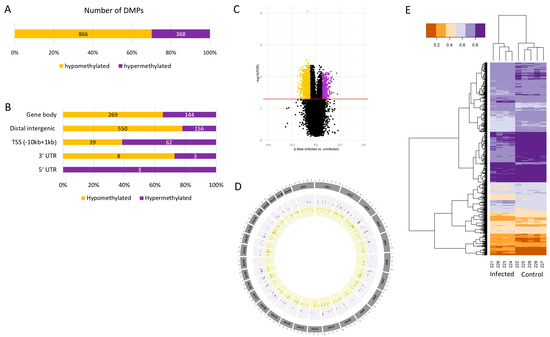 Overview of the dLN DMPs showing the counts of hypomethylated (yellow) and hypermethylated (purple) DMPs. (A) Number of hypomethylated and hypermethylated DMPs (FDR < 0.05 and |Δβ| > 5%). (B) DMP annotation (−10 kb to +1 kb from the nearest TSS) for both hypomethylated and hypermethylated DMPs. (C) Volcano plots of the DMPs, where black dots represent the DMPs that are not significantly differentially methylated, while the yellow or purple dots indicate the DMPs that are significantly hypermethylated or hypomethylated (FDR < 0.05 and |Δβ| ≥ 5%). The red line represents FDR < 0.05. (D) Circular plots of the genome distribution of the hypomethylated and hypermethylated DMPs. (E) Heatmaps of the hypomethylated and hypermethylated DMPs for each animal in either the control or the infected group. The legend indicates the beta coefficient values.