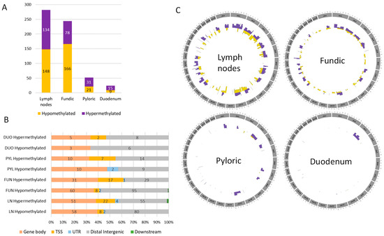 Overview of the fundic DMRs showing the hypomethylated (yellow) and hypermethylated (purple) regions. (A) Number of hypomethylated and hypermethylated DMRs (p-value ≤ 0.001 and |Δβ| ≤ 10%) identified across four cattle tissues. (B) DMR annotation (−10 kb to +1 kb from the nearest TSS) showing the hypomethylated and hypermethylated DMRs in each tissue (LN: lymph nodes; FUN: fundic; PYL: pyloric; DUO: duodenum). (C) Circular genome distribution plots of the hypomethylated and hypermethylated DMRs in each tissue.