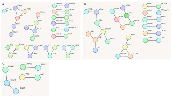 STRING network analysis of DMR and DPMG genes from (A) dLN, (B) FUN, and (C) PYL tissues. Each node represents a gene, and the lines represent predicted interactions (with a minimum confidence score of 0.7). The line thickness indicates the strength of the supporting data for the predicted interactions.