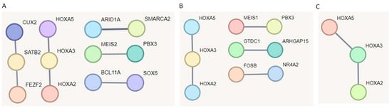 In addition, we constructed functional protein association networks for dLN, FUN, and PYL tissues using the combined list of DMGs and DPMGs. We observed limited interactions in both tissues (Figure 6). In dLN, DMGs, and DPMGs showed two interaction hubs with three genes per hub and three interactions with only two genes. In the FUN, we observed only four interactions, each involving a few genes. In the PYL, we identified a single interaction involving three genes (Figure 6). HOX2, HOX3, and HOX5 genes were consistently observed in all analyzed tissues.
