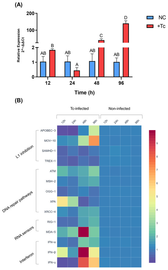 Trypanosoma cruzi induces LINE-1 overexpression and activates interferon signaling in vitro. (A) Relative expression of LINE-1 in Tc-infected (red) and non-infected (blue) HEK-293 cells over time. Different letters indicate statistically significant differences between groups (p < 0.0001). (B) Heatmap depicting the relative expression of genes involved in LINE-1 regulation, including inhibitory factors, DNA repair pathways, nucleic acid sensors, and interferons. Gene expression levels were calculated using the 2−ΔΔCt method. NC: negative control, non-infected cells. +Tc: cells infected with T. cruzi.
