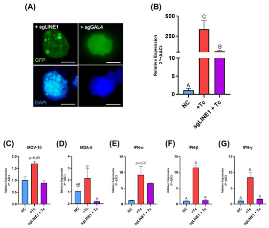 To determine whether Tc-induced L1 activation is essential for sustaining the IFN-mediated immune response, we utilized transfected cells in which L1 expression was suppressed using the CRISPR/dCas9 system. As shown in Figure 2A, cells transfected with a guide RNA targeting the ORF2 region of L1 (gLINE-1) exhibited distinct bright nuclear foci, whereas negative control cells transfected with gGAL4 displayed only diffuse nuclear GFP fluorescence, confirming the specificity of the targeting approach. A subsequent analysis of L1 expression in HEK-293 cells at 48 hpi revealed a 5.5-fold reduction in L1 transcript levels in gLINE-1-transfected and infected cells compared to the infected-only group (p = 0.027), confirming effective gene suppression (Figure 2B).