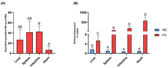 Parasite load and LINE-1 expression in various organs of mice during the chronic phase of Chagas disease. (A) Absolute quantification of T. cruzi burden in tissue samples, determined by qPCR targeting the Tc40s region of T. cruzi cDNA. (B) Relative expression of LINE-1 in different organs of BALB/c mice, either infected or uninfected with T. cruzi. Gene expression was quantified using the 2−ΔΔCt method. Data are presented as mean ± standard deviation, with different letters indicating statistically significant differences between groups. NC: negative control, non-infected cells. +Tc: cells infected with T. cruzi.