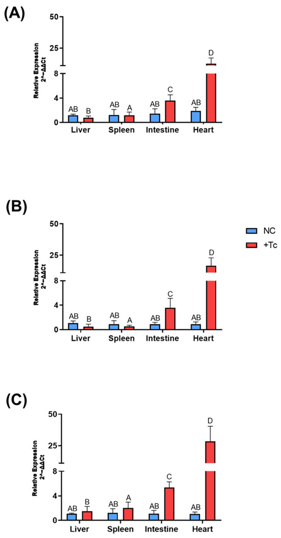 Expression of interferons associated with the immune response in various tissues of BALB/c mice, either infected or uninfected with Trypanosoma cruzi. Gene expression levels were quantified using the 2−ΔΔCt method. Data are presented as mean ± standard deviation for both the T. cruzi-infected group (+Tc, red bars) and the uninfected control group (NC, blue bars). The analyzed genes include (A) IFN-α, (B) IFN-β, and (C) IFN-γ. Different letters indicate statistically significant differences between samples.