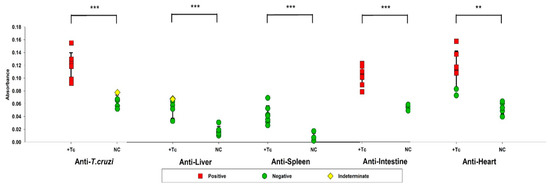 Assessment of antibody production against Trypanosoma cruzi antigens and self-antigens from the liver, spleen, intestine, and heart. Serum samples from BALB/c mice, either infected or uninfected with T. cruzi, were analyzed by ELISA to quantify IgG antibody levels against T. cruzi-specific antigens and organ-derived proteins. Animals with positive serology are represented in red, those with indeterminate serology in yellow, and seronegative animals in green. Data are presented as absolute levels, and bars indicate mean + standard deviation. ** p ≤ 0.01, *** p ≤ 0.001.