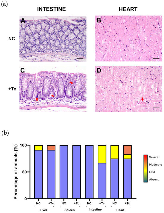 Histopathological assessment of inflammatory infiltrates in Trypanosoma cruzi-infected and uninfected animals. (a) Representative histological images of intestinal and cardiac tissues from control and infected groups. The upper panel displays images of intestinal (A) and cardiac (B) tissues from control animals, both exhibiting normal histological architecture without pathological alterations. The lower panel shows intestinal (C) and cardiac (D) tissues from infected animals, highlighting the presence of inflammatory infiltrates, indicated by red arrows. Hematoxylin and eosin (HE) staining. Scale bar: 100 μm. (b) Proportion of animals presenting inflammatory infiltrates in the liver, spleen, heart, and intestine, assessed at 90 dpi in the infected group and at an equivalent time point in the uninfected group. The severity of inflammation was categorized into four grades: absent (blue, 0), mild (yellow, 1), moderate (orange, 2), and severe (red, 3). NC: negative control, non-infected cells. +Tc: cells infected with T. cruzi.