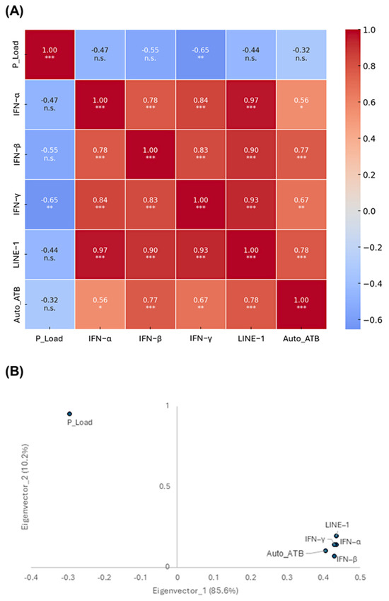 Interaction of LINE-1 expression with parasite- and host-related factors in a murine model of Chagas disease. (A) Heatmap illustrates the correlation between parasite load (P_Load), autoantibody titers (Auto_ATB), interferon (IFN) production, and LINE-1 expression. Statistical significance is indicated as follows: * p < 0.05, ** p < 0.01, *** p < 0.001, and non-significant (n.s.). (B) Principal component analysis (PCA) eigenvectors representing key parameters associated with Chagas disease pathogenesis. The percentage in parentheses denotes the proportion of variance explained by each eigenvector. Variables positioned within the same quadrant exhibit similar behavior.