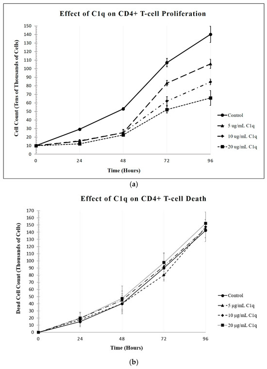 To assess the effect of C1q on the Molt-4 T-cells, a cell proliferation assay was conducted using the trypan blue exclusion assay, in which the numbers of live and dead cells were analyzed in samples taken from cultures of the cells incubated (0–96 h, 37 °C) with concentrations of C1q ranging from 0 to 20 μg/mL. Since the concentration of C1q in plasma is approximately 90–110 µg/mL, the highest concentration used in the experiment was still 5× less than the normal concentration of C1q. The assay was run in duplicates and repeated three times, with the viability assay performed at 24 h intervals. As shown in Figure 2a, the increasing concentration of C1q in the T-cell cultures inhibited cell proliferation, with the culture with 20 μg/mL of C1q having less than 50% of the number of cells in the control after 96 h. The relatively small bars of standard error illustrate the significance in the differences between the counts for each experimental group.
