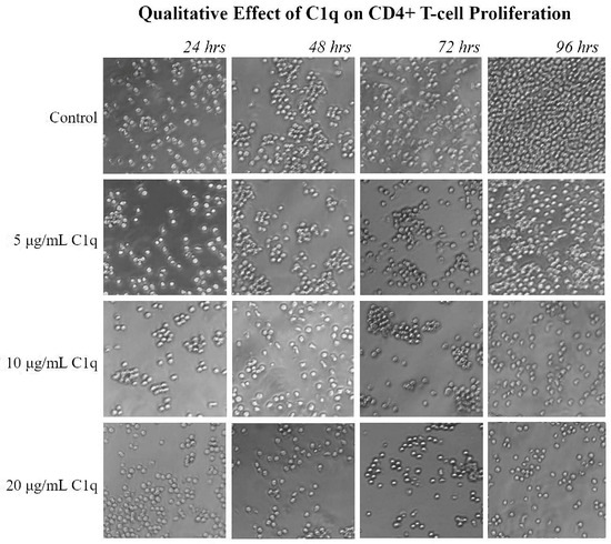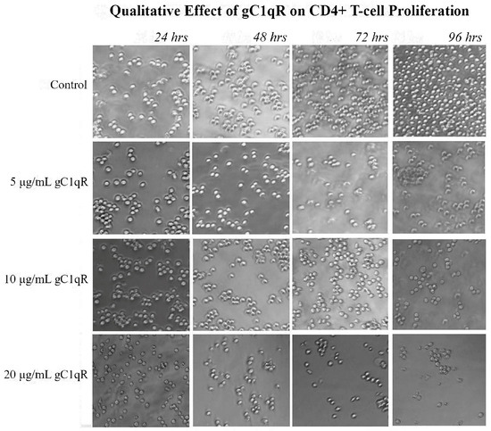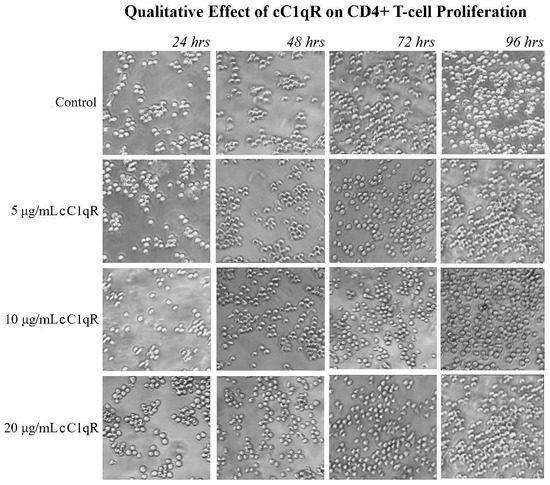 The effects of the increasing cC1qR concentrations on CD4+ T-cell proliferation were also detected qualitatively, through pictures taken at 24 h intervals. The similarity between the control and the 20 μg/mL cC1qR culture was qualitatively similar at each time point (Figure 7).