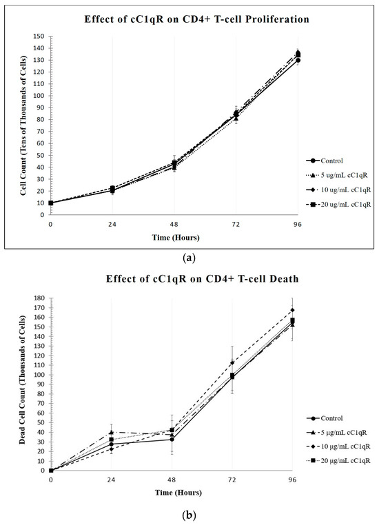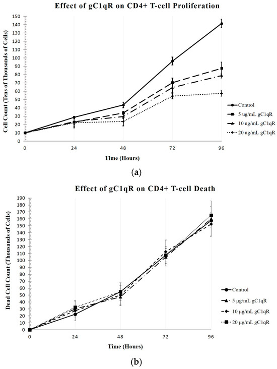 Since CD4+ T-cells have been shown to express surface C1q, we investigated to see how the binding of gC1qR and cC1qR to membrane-associated C1q impacted the survival or proliferation of the Molt-4 T-cells. To quantitatively measure the effects of gC1qR, cell proliferation assays were conducted by assessing the numbers of live and dead cells in cultures of CD4+ T-cells after incubation with various concentrations of gC1qR over a period of 96 h. The cells were counted at 24 h intervals, and each assay was performed in duplicate and repeated three times (n = 3). As shown in Figure 4a, the increasing concentrations of gC1qR suppressed T-cell proliferation, with the maximal effect seen at 20 μg/mL of C1q. Analysis of the dead cell count also revealed that the number of dead cells was insignificant, since the cell count with each concentration of gC1qR remained unchanged, indicating that gC1qR is not cytotoxic, but rather suppressive (Figure 4b). At the 96 h mark, the control sample contained 157.500 ± 9.5742 × 103 dead cells, while the culture incubated with 20 μg/mL of gC1qR contained 165.000 ± 12.9099 × 103 dead cells. Overall, considering the impact of the treatment on both the live and dead cell counts, the effects of C1q and gC1qR on T-cell proliferation were extremely similar.