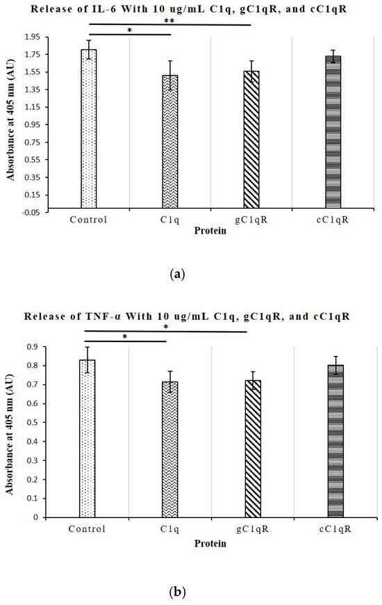 The release of key regulatory pro-inflammatory cytokines from Molt-4 CD4+ T-cells after incubation with C1q, gC1qR, and cC1qR. (a) The release of the immunostimulatory cytokine IL-6 was significantly altered when CD4+ T-cells were cultured with 10 μg/mL of C1q and gC1qR for 36 h (n = 4 each); * p < 0.05, ** p < 0.01, using Student’s t-test. (b) The release of TFN-α was significantly altered by culturing the CD4+ T-cells with 10 μg/mL of C1q and gC1qR for 36 h (n = 4 each). * p < 0.05, calculated using Student’s t-test.