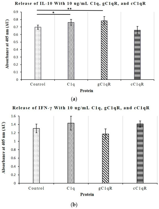 The effects of C1q, gC1qR, and cC1qR on the release of IL-10 from Molt-4 CD4+ T-cells. The release of the immunosuppressant cytokine IL-10 was not seen to be altered when Molt-4 T-cells were incubated with C1q, gC1qR, or cC1qR (p > 0.05). The relative absorbances were as follows: control culture—1.444 ± 0.2675; culture with 10 μg/mL of C1q—1.298 ± 0.1425; culture with 10 μg/mL of gC1qR—1.304 ± 0.1545; culture with 10 μg/mL of cC1qR—1.525 ± 0.7949 (n = 4 each); * p < 0.05, ** p < 0.01. (a) The release of the immunostimulatory cytokine INF-γ was not seen to be altered significantly under the influence of C1q, gC1qR, or cC1qR (p > 0.05). (b) The relative absorbances were as follows: control culture—1.304 ± 0.2786; culture with 10 μg/mL of C1q—1.430 ± 0.7414; culture with 10 μg/mL of gC1qR—1.173 ± 0.2466; culture with 10 μg/mL. of cC1qR—1.411 ± 0.3526 (n = 4 each).