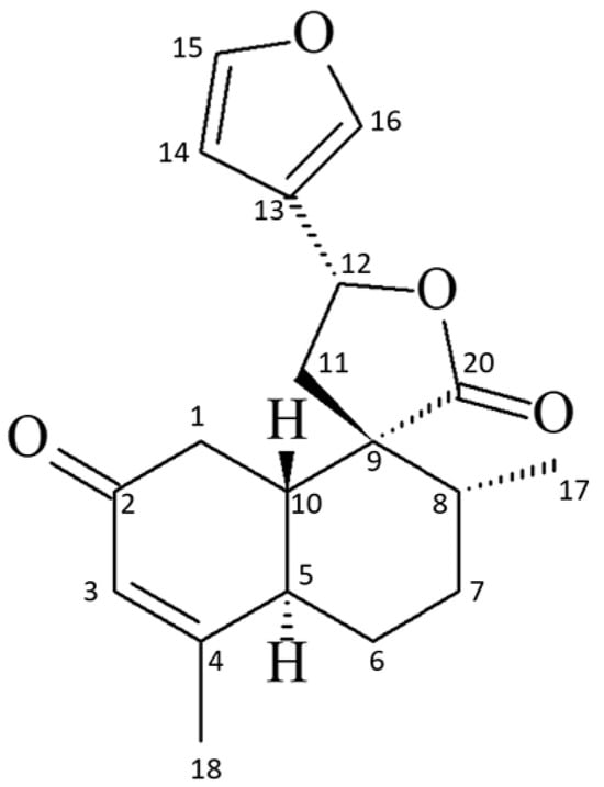 The analysis of the 1H NMR spectrum (chemical shifts δ in ppm) indicated the presence of a secondary methyl group (Me-17) at δ 1.16 (3H, d, J = 6.80 Hz), and a vinyl methyl group at δ 1.97 (3H, dd, J = 1.27, and 1.20 Hz), confirming the presence of a methyl group attached to sp2 carbon (Me-18). The β-substituted furyl group is evidenced at δ 6.41 (1H, br dd, J = 1.83, and 0.89 Hz), 7.45 (1H, dd, J = 1.83, and 1.66 Hz) and 7.46 (1H, ddd, J = 1.66, 0.89, and 0.72 Hz). Hydrogens at position 1 were assigned to be axial and equatorial, respectively, δ 2.19 (1H, dd, J = 15.61, and 13.80 Hz) and δ 2.54 (1H, dd, J = 15.61, and 2.80 Hz), attributed based in their J values. The hydrogen attached to sp2 carbon (H3) shows a multiplet at 5.89 (1H, m, J = 1.27, and 1.19 Hz). The coupling constant between the hydrogens H5 and H10 (J = 10.70 Hz) confirms the trans-junction of the decalin system. The coupling constants of the hydrogens H12 and H11 (CH2 methylene group) allowed the unambiguous assignments at δ 2.42 (1H, dd, J = 13.95, and 8.62 Hz), δ 2.37 (1H, dd, J = 13.95, and 8.65 Hz) and δ 5.43 (1H, ddd, J = 8.65, 8.62, and 0.72 Hz). 1H NMR spectra is available on Supplementary Material. The IR and 1H NMR data are consistent with the literature [,,].