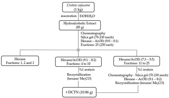 Phytochemical approach for isolation of the trans-dehydrocrotonin (t-DCTN). EtOH = Ethanol; H2O = Water; EtOAc = Ethyl Acetate; Me2CO = acetone.