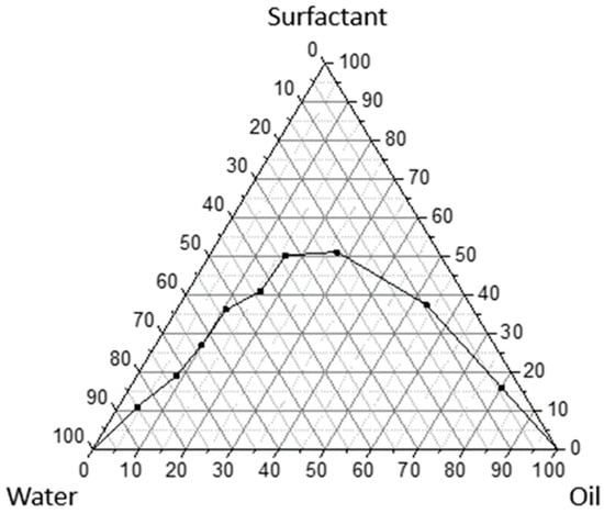 The stability of classical colloidal systems (micro- and nano-emulsions) is governed by the physico-chemical properties of components and also the balance of the molecular interactions between the nanodomains of the colloidal system [,,,,,]. The preparation of nanoemulsions requires mechanical energy or energy generated by the chemical potential inherent to the components. High-energy emulsification (dispersion) affords fine nanoemulsions by using mechanical energy through high shear stress, and is generally used in industrial operations through high-pressure homogenizers or ultrasonic generators, which make it possible to control the size and distribution of droplets. Low-energy emulsification (condensation) basically requires the chemical energy stored in the system itself for the formation of emulsions with very small droplets, and goes through the phase transition during the emulsification process, which can occur at constant temperature while varying the composition, or by keeping the composition constant and varying the temperature [,,,,,,]. Meanwhile, the method of phase inversion temperature (PIT) is based on the change in solubility of nonionic surfactants with the change in temperature [].