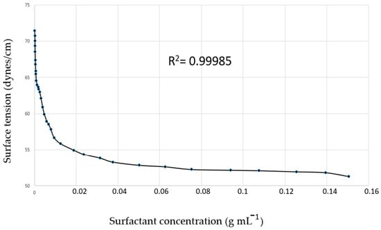 The experimental correlation between CMC and the surface properties of surfactants is evaluated, aiming to understand the micellar aggregate formation, which decreases the free energy of the system by reducing the interaction between the hydrophobic groups and the surfactant. Therefore, the CMC provides optimal measurement of surfactant concentration, ensuring the system’s stability. Above the CMC, the concentration of the surfactant results in more micelle formation, but on the other hand, it reduces the free energy of the system. So, below the CMC, the surfactant molecules remain in the form of monomers [,,,,,].