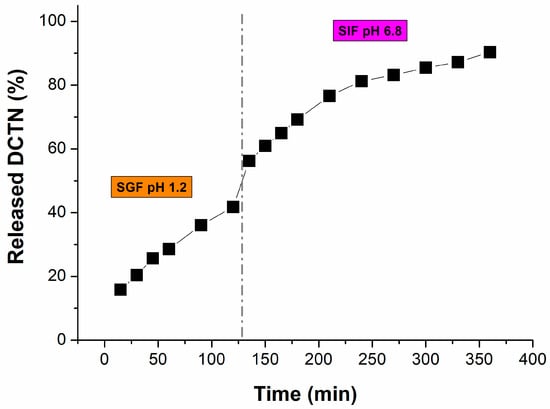 In the first stage (SGF), the release of t-DCTN exhibited a two-phase pattern. The initial phase featured a rapid onset release (burst effect) of 25.68 ± 0.02% of t-DCTN at 45 min., which can be attributed to the weakly bound or absorbed drug (t-DCTN) incorporated in the surface of the carrier system SNEDDS-CO. The second phase is characterized by a more controlled drug release profile, which can be attributed to the diffusion of the t-DCTN through the SNEDDS-CO-DCTN formulation, reaching a maximum cumulative release of 41.76 ± 0.01% at 120 min. In the second stage, SIF is released initially at 56.23 ± 0.03% of t-DCTN at 135 min., where the sustained profile is maintained until of end of the experiment, with a maximum cumulative release of 90.33 ± 0.01% at 360 min. As evidenced (Figure 7), the process of drug release diffusion was more favored at the intestinal medium (pH 6.8), when compared to the gastric one (pH 1.2), which is possibly associated with t-DCTN enhanced solubility at higher values of pH. Phenomena such this present one were observed by Arriagada et al. (2020) and Estime et al. (2010) for other pharmaceuticals [,].