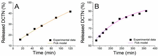 Adjustment of the in vitro release profile of t-DCTN from the SNEDDS-CO-DCTN formulation (squares) to Fickian’s kinetic model (lines): (A) (SGF, simulated gastric fluid) and (B) (SIF, simulated intestinal fluid).
