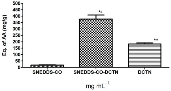 Determination of total antioxidant capacity equivalent to ascorbic acid (AA) mg/g of the SNEDDS systems and the unload t-DCTN. * and ** mean the statistical difference between the samples related to SNEDDS-CO system (p < 0.001). # means the statistical difference between SNEDDS-CO-DCTN system and t-DCTN-DMSO solution (p < 0.001). SNEDDS-CO = oil-in-water (O/W) colloidal carrier system, containing copaiba oil (0.5%, w/w). SNEDDS-CO-DCTN containing 1 mg of t-DCTN per mL of the carrier SNEDDS-CO. DCTN = solution containing 10 mg of t-DCTN per mL of DMSO.
