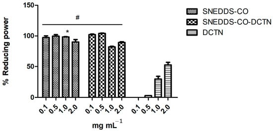 Antioxidant capacity via reducing power of SNEDDS systems and the unload t-DCTN. * means the statistical difference between SNEDDS-CO and SNEDDS-CO-DCTN systems at 1.0 mg mL−1 (p < 0.001). # means the statistical difference of both SNEDDS-CO and SNEDDS-CO-DCTN at the same concentrations by comparing with t-DCTN-DMSO solution (p < 0.001). SNEDDS-CO = oil-in-water (O/W) colloidal carrier system, containing copaiba oil (0.5%, w/w). SNEDDS-CO-DCTN containing 1 mg of t-DCTN per mL of the carrier SNEDDS-CO. DCTN = solution containing 10 mg of t-DCTN per mL of DMSO.