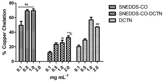 Antioxidant capacity via copper ion chelation of SNEDDS systems and the unload t-DCTN. * means the statistical difference between SNEDDS-CO and SNEDDS-CO-DCTN systems, at 0.1 to 1.0 mg mL−1 (p < 0.001). ** means the statistical difference between SNEDDS-CO-DCTN and SNEDDS-CO systems, at 2 mg mL−1 (p < 0.001). # means the statistical difference between SNEDDS-CO system and t-DCTN-DMSO solution, at 0.1 to 1.0 mg mL−1 (p < 0.001). ## means the statistical difference between t-DCTN-DMSO solution and SNEDDS-CO system, at 2 mg mL−1 (p < 0.001). a, b mean the statistical difference between SNEDDS-CO-DCTN and t-DCTN-DMSO solution, at 1 mg mL−1 and 2 mg mL−1, respectively (p < 0.001). SNEDDS-CO = oil-in-water (O/W) colloidal carrier system, containing copaiba oil (0.5%, w/w). SNEDDS-CO-DCTN containing 1 mg of t-DCTN per mL of the carrier SNEDDS-CO. DCTN = solution containing 10 mg of t-DCTN per mL of DMSO.