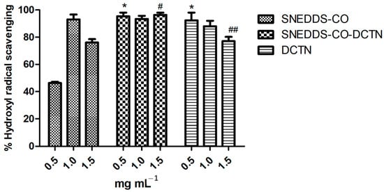 Hydroxyl radical sequestration capability of SNEDDS systems and the unload t-DCTN. * means the statistical difference of SNEDDS-CO-DCTN system and t-DCTN-DMSO solution by comparing with SNEDDS-CO system, at 0.5 mg mL−1 (p < 0.001). # means the statistical difference between SNEDDS-CO-DCTN and SNEDDS-CO systems, at 1.5 mg mL−1 (p < 0.001). ## means the statistical difference between SNEDDS-CO-DCTN and t-DCTN-DMSO solution, at 1.5 mg mL−1 (p < 0.01). SNEDDS-CO = oil-in-water (O/W) colloidal carrier system, containing copaiba oil (0.5%, w/w). SNEDDS-CO-DCTN containing 1 mg of t-DCTN per mL of the carrier SNEDDS-CO. DCTN = solution containing 10 mg of t-DCTN per mL of DMSO.
