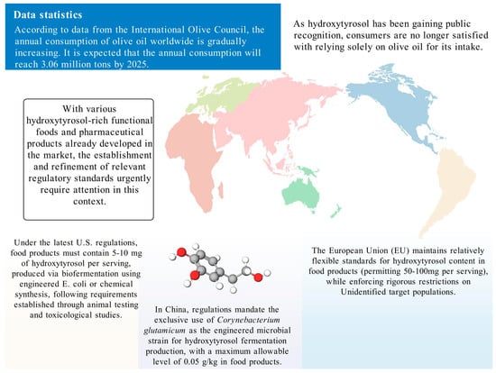 Wang, Z.; Lei, Z.; Zhang, H.; Liu, Z.; Chen, W.; Jia, Y.; Shi, R.; Wang, C. From Biosynthesis to Legislation: A Review of Hydroxytyrosol’s Biological Functions and Safety. Int. J. Mol. Sci. 2025, 26, 4470. https://doi.org/10.3390/ijms26104470