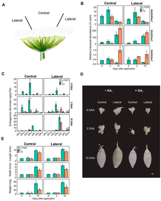 - Curaba, J.; Moritz, T.; Blervaque, R.; Parcy, F.; Raz, V.; Herzog, M.; Vachon, G. AtGA3ox2, a Key Gene Responsible for Bioactive Gibberellin Biosynthesis, Is Regulated during Embryogenesis by LEAFY COTYLEDON2 and FUSCA3 in Arabidopsis. Plant Physiol. 2004, 136, 3660–3669. [Google Scholar] [CrossRef]