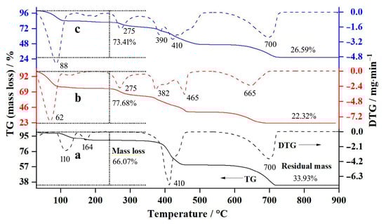 Table 6 shows the experimental and theoretical values of the mass-loss and residual-mass percentages of calcium acetate (CA), confirming that the chemical formula of the synthesized CA was the Ca(CH3COO)2·H2O (calcium acetate monohydrate). The thermal decomposition of various solid-state compounds is a complex process; therefore, some experimental values of the mass-loss percentages in the thermal decomposition steps deviated slightly from the theoretical values [,]. However, the experimental values of the overall mass loss and residual mass percentages of the synthesized CA corresponded well with the theoretical values. Consequently, the thermal decomposition process of CA could be classified as three steps as demonstrated in Equations (4)–(6):
