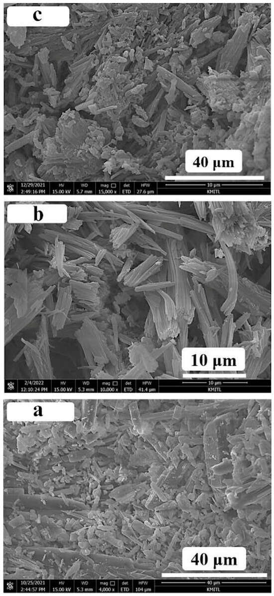 The morphologies of all the calcium compounds derived from scallop-shell CaCO3 powders were observed by the SEM technique. The SEM image of the CA product is demonstrated in Figure 4a. The morphologies of the CA sample at the magnification of 4000 times show the plate-shaped crystals with different sizes from around 5 to 30 μm. The morphology of the CL compound at the magnification of 10,000 times is also demonstrated in Figure 4b, which shows large rod-shaped clusters with length and width ranges of around 2–20 and 0.2–1 µm, respectively. The SEM technique was also used to observe the morphology of the CAL product, and its SEM result at 15,000-time magnification is presented in Figure 4c. The morphology of CAL shows the same characteristics as the morphologies of both the CA and CL compounds. A mixture of plate/rod-shaped crystals with different sizes from around 5 to 35 μm was observed. Moreover, lots of small particles were assigned as the broken products of larger particles.