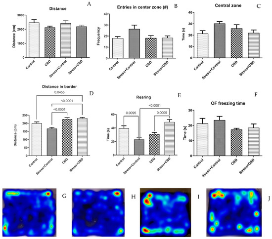 Anxiety-like behavior assessment in the OF test. (A) Distance traveled during the trial, F (3, 36) = 1.479, p = 0.236. (B) Number of entries in the center zone (30 × 30 cm2), F (3, 36) = 2.910, p = 0.0481. (C) Time spent in central zone during the trial, F (3, 36) = 1.800, p = 0.1652. (D) Distance traveled outside the central zone, F (3, 36) = 12.48, p < 0.0001. (E) Rearing—defined as the vertical exploration measured by counting the number of supported rearing, F (3, 36) = 12.67, p < 0.0001. (F) OF freezing time—time spent in a freezing state, F (3, 34) = 1.317, p = 0.2849. (G–J) Heatmap of path of all groups. Data are expressed as mean ± SEM.