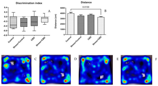 CBD administration did not significantly influence the discrimination index (Stress + CBD—−0.1047 ± 0.04373 vs. CBD—−0.1823 ± 0.07594 vs. Stress + Control—−0.2638 ± 0.07536 vs. Control—−0.2730 ± 0.09653, p = 0.2453), as can be seen in Figure 2A. As for the distance traveled in NOR, the Control group displayed a longer distance traveled compared to the Stress + CBD group.
